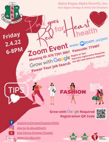 Join the members of Alpha Kappa Alpha Sorority, Inc., Iota Sigma Omega & Delta Chi chapter for the 2022 Pink Goes Red virtual event! We invite the community to join us for a virtual Pink Goes Red Lab to discuss Heart Health Awareness in a safe informative and fun environment. Grab your favorite red top, t-shirt, dress or anything Red and join us as we take you on a virtual ride for Heart Health Awareness!